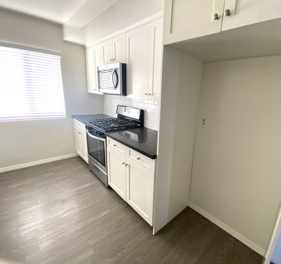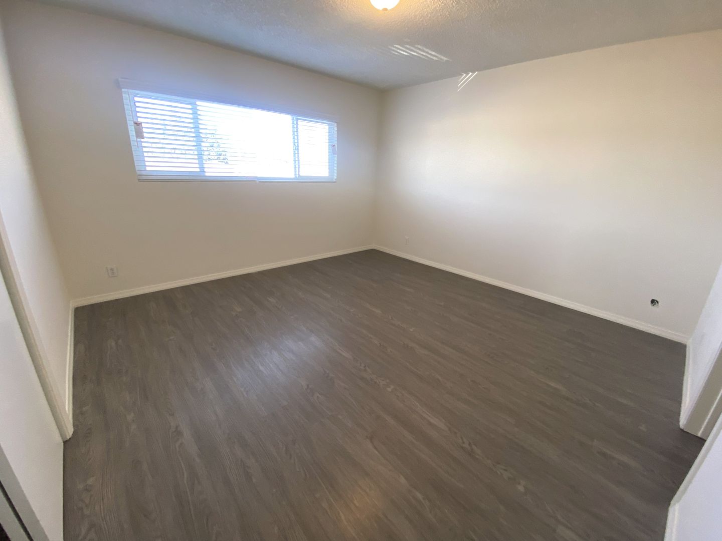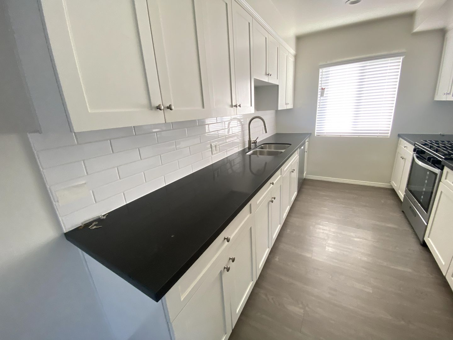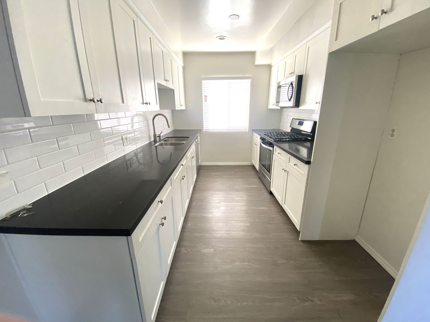 This spacious 3-bedroom, 1.5-bathroom upper rear unit is located in a convenient location - close to freeways, schools and businesses. Completely remodeled kitchen with white shaker cabinets with black quartz tops and all stainless appliances which include a dishwasher, stove, and refrigerator (not in picture). Beautiful laminate wood floors throughout. Updated bathrooms. New paint throughout. Primary bedroom with private half bath. Newer dual glazed vinyl windows were installed throughout giving improved insulation. Coin laundry on-site. One covered parking space. Quiet 4-unit building. 1-year lease. No Smoking. No Pets.
