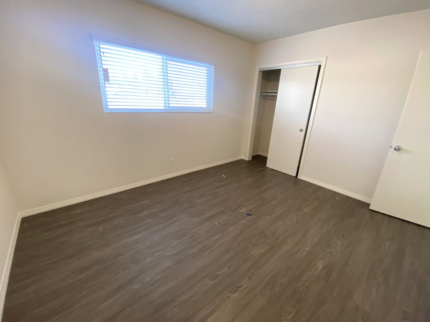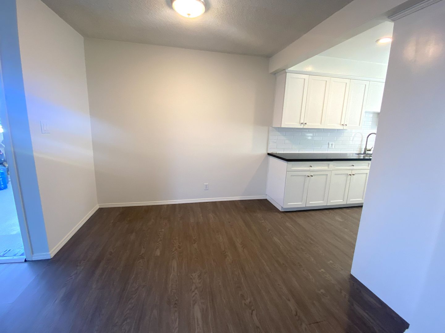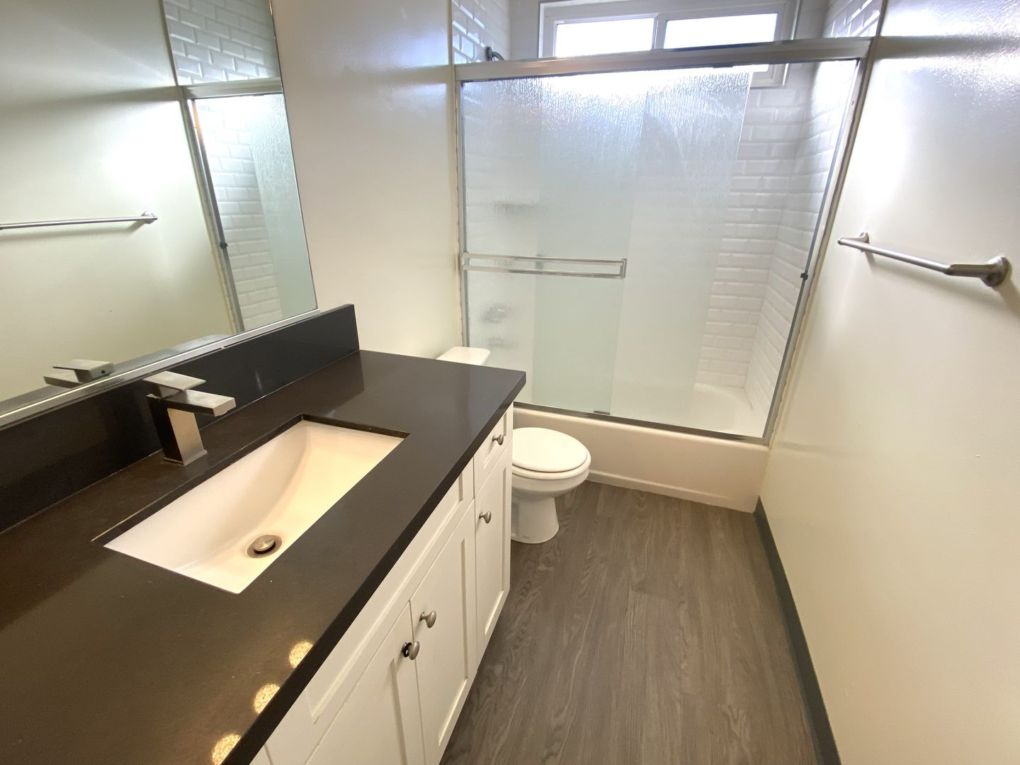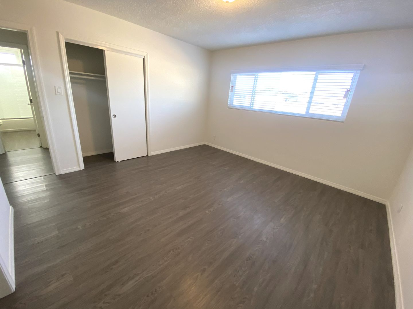 This spacious 3-bedroom, 1.5-bathroom upper rear unit is located in a convenient location - close to freeways, schools and businesses. Completely remodeled kitchen with white shaker cabinets with black quartz tops and all stainless appliances which include a dishwasher, stove, and refrigerator (not in picture). Beautiful laminate wood floors throughout. Updated bathrooms. New paint throughout. Primary bedroom with private half bath. Newer dual glazed vinyl windows were installed throughout giving improved insulation. Coin laundry on-site. One covered parking space. Quiet 4-unit building. 1-year lease. No Smoking. No Pets.