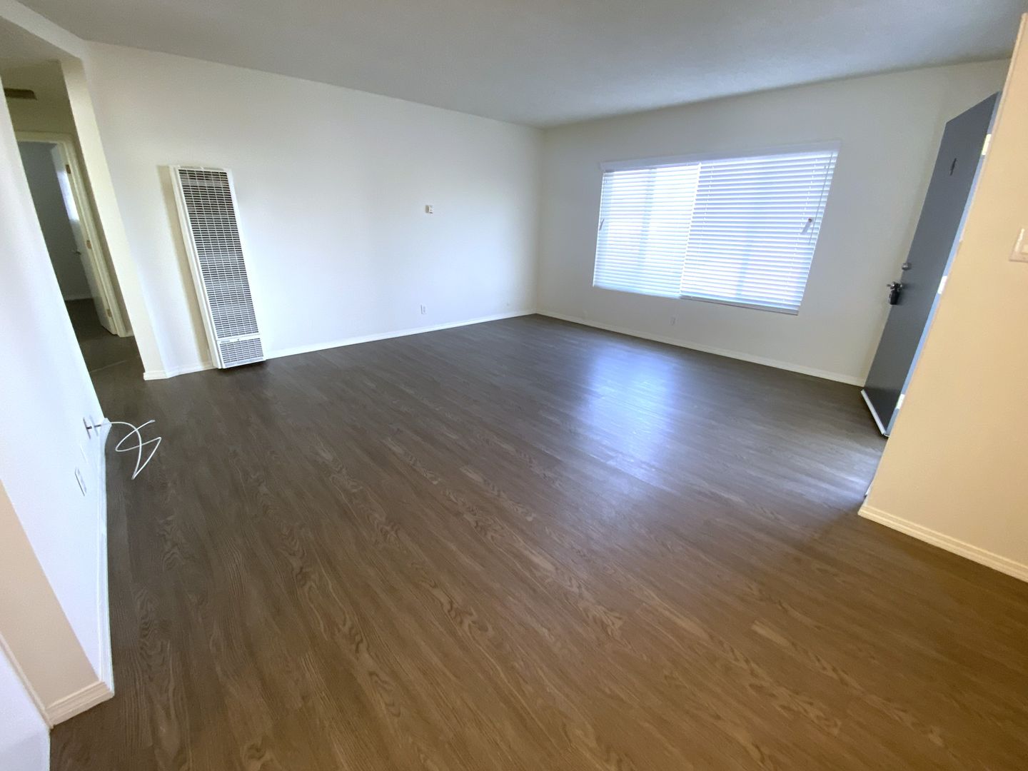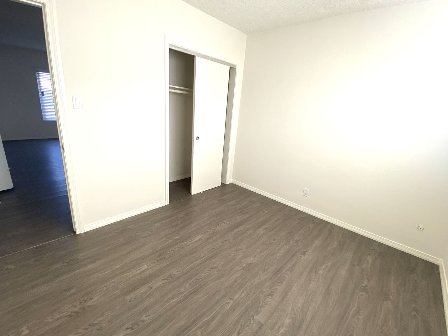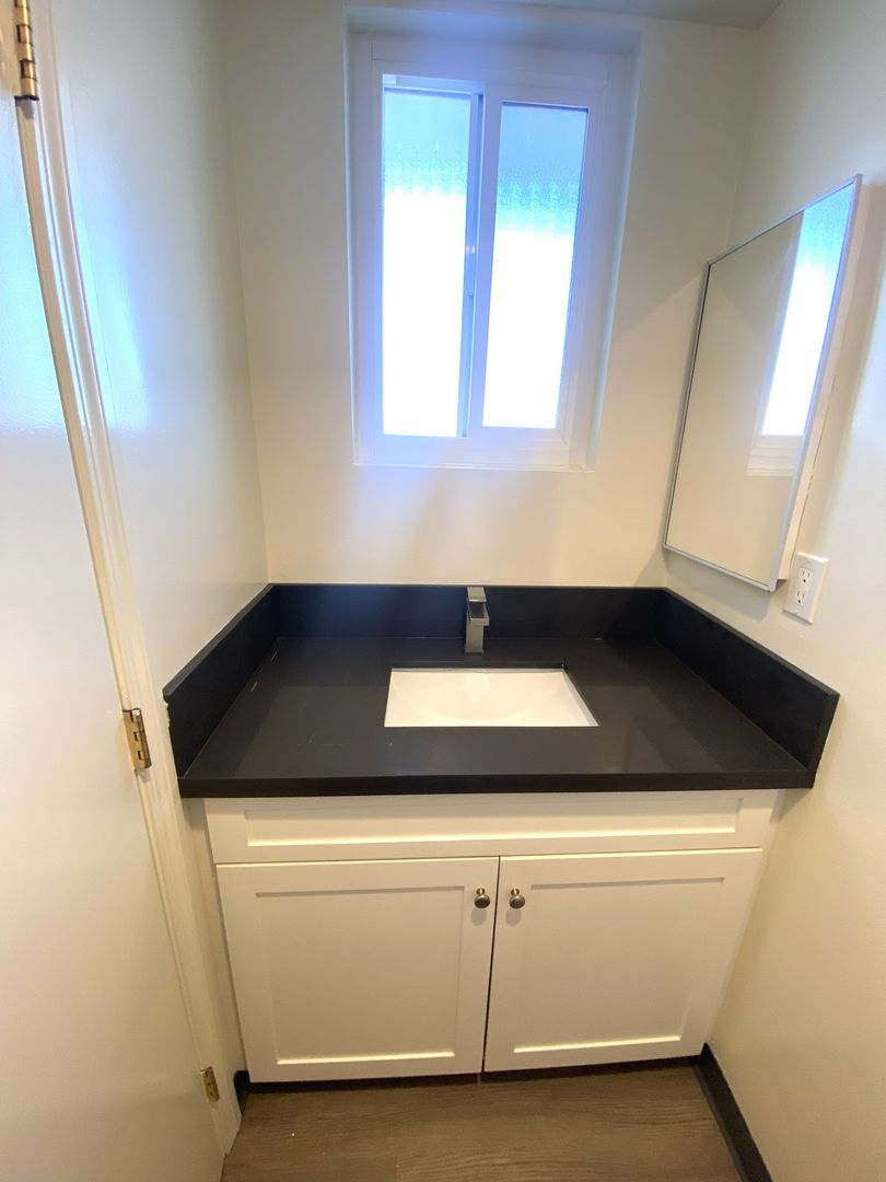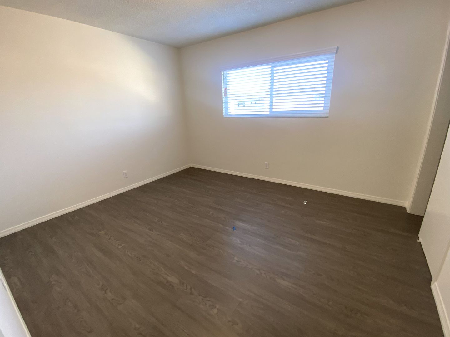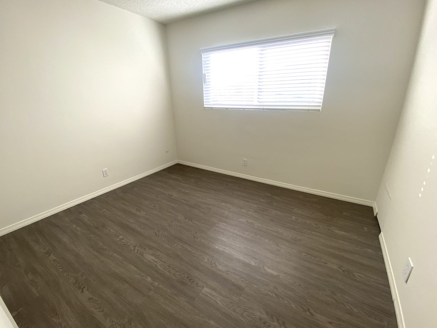 This spacious 3-bedroom, 1.5-bathroom upper rear unit is located in a convenient location - close to freeways, schools and businesses. Completely remodeled kitchen with white shaker cabinets with black quartz tops and all stainless appliances which include a dishwasher, stove, and refrigerator (not in picture). Beautiful laminate wood floors throughout. Updated bathrooms. New paint throughout. Primary bedroom with private half bath. Newer dual glazed vinyl windows were installed throughout giving improved insulation. Coin laundry on-site. One covered parking space. Quiet 4-unit building. 1-year lease. No Smoking. No Pets.