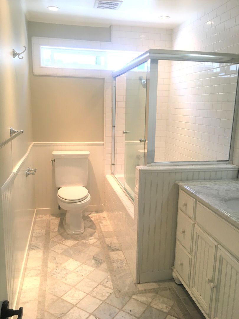 The updated primary bathroom features elegant tumbled marble and recessed lighting. Gleaming hardwood floors run throughout the home, including the staircase, adding warmth and character.
