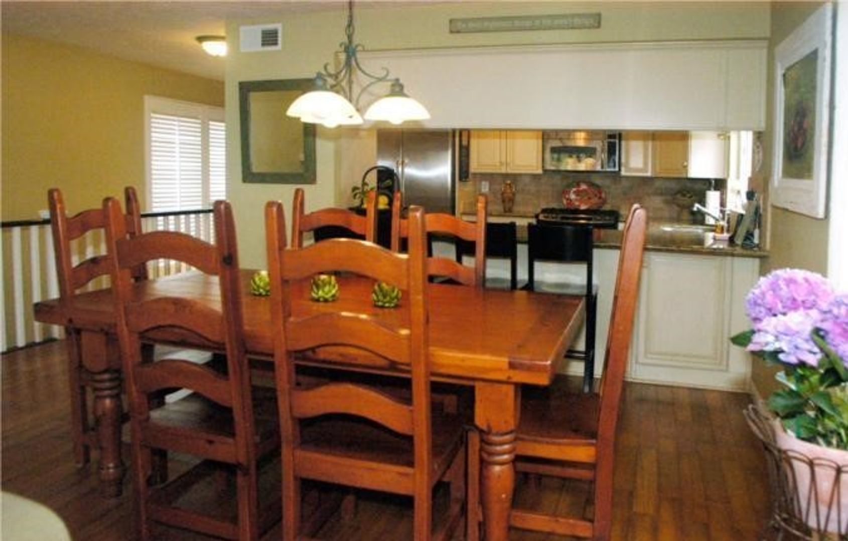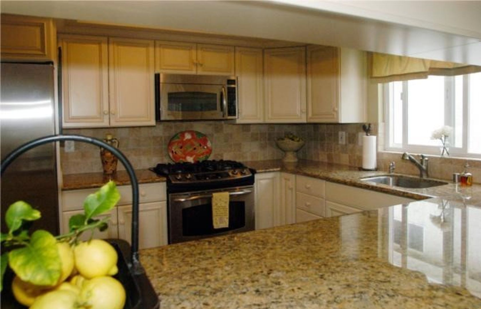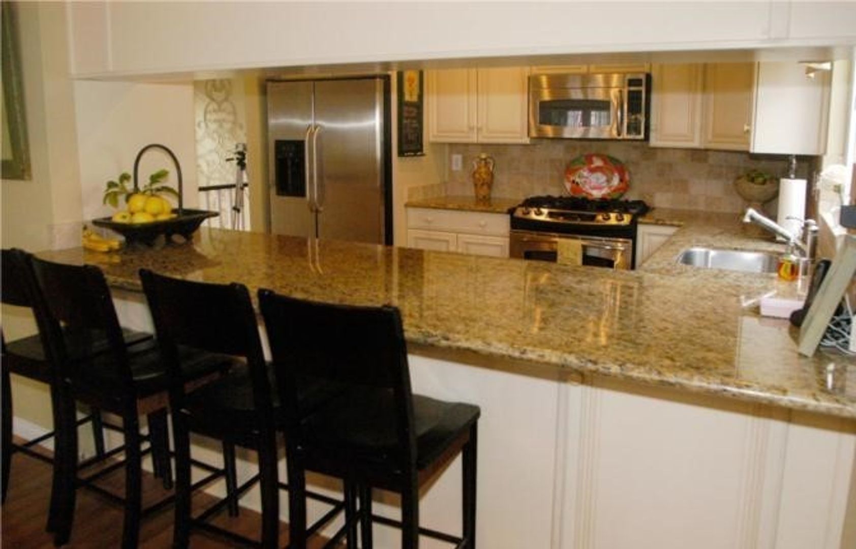 The spacious, open-concept living area boasts high ceilings and a cozy fireplace, with French doors that lead out to a private deck—perfect for relaxing or entertaining. The thoughtfully designed kitchen includes granite countertops, updated cabinetry, stainless steel appliances, and a convenient breakfast bar.