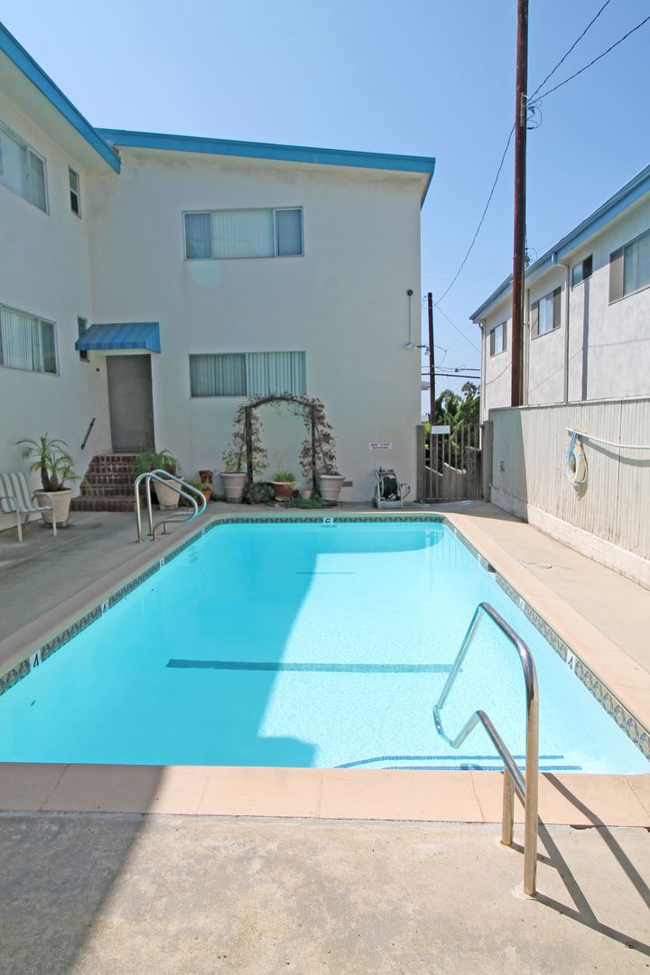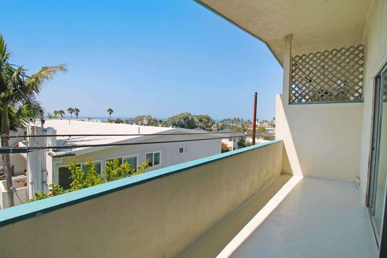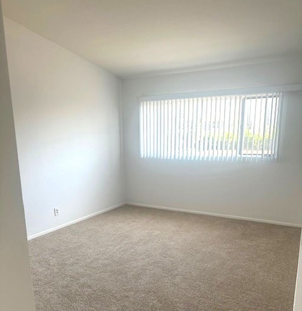 Upper Rear 2 bdrm unit.  Great ocean views from the living area and balcony of this unit.  Kitchen includes stove and refrigerator.  Good sized bedrooms with hallway bathroom.  Nice new laminate wood floors throughout living area. Master bedroom with private master bathroom.  New carpet in bedrooms and new paint throughout. 1 car carport parking with storage.  Coin laundry on site.  Community pool.  Steps to the Riviera with great restaurants and shops.  1 year lease. No smoking. No pets.